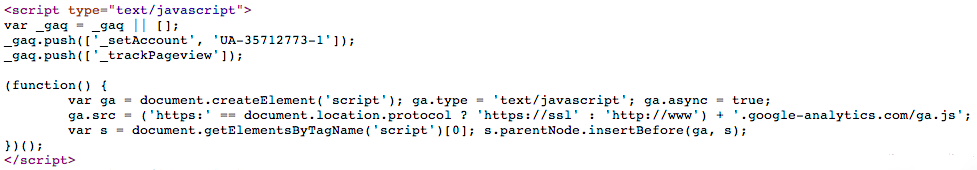若要使用谷歌分析(以下简称GA),需要在页面中插入一段它提供的javascript片段,这个片段往往被称为埋点代码。下面是我的博客中所放置的谷歌分析埋点代码截图: