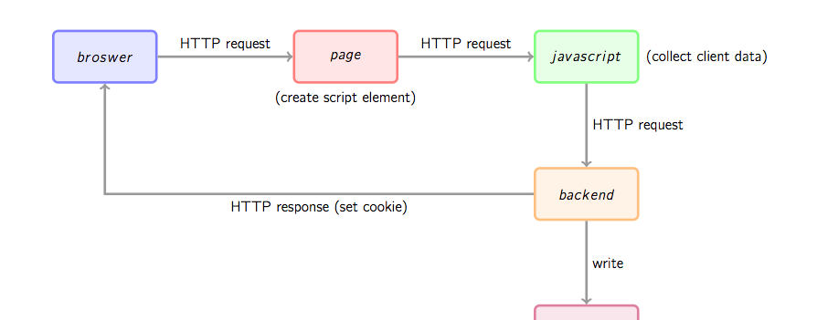 首先,用户的行为会触发浏览器对被统计页面的一个http请求,这里姑且先认为行为就是打开网页。当网页被打开,页面中的埋点javascript片段会被执行,用过相关工具的朋友应该知道,一般网站统计工具都会要求用户在网页中加入一小段javascript代码,这个代码片段一般会动态创建一个script标签,并将src指向一个单独的js文件,此时这个单独的js文件(图1中绿色节点)会被浏览器请求到并执行,这个js往往就是真正的数据收集脚本。数据收集完成后,js会请求一个后端的数据收集脚本(图1中的backend),这个脚本一般是一个伪装成图片的动态脚本程序,可能由php、python或其它服务端语言编写,js会将收集到的数据通过http参数的方式传递给后端脚本,后端脚本解析参数并按固定格式记录到访问日志,同时可能会在http响应中给客户端种植一些用于追踪的cookie。