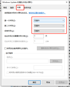 4、接下再切换到“恢复”选项,将默认的“重新启动服务”改为“无操作”,然后点击“应用”“确定”。