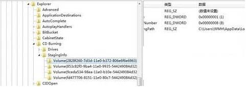 2、在注册表编辑器的左侧展开定位到HKEY_CURRENT_USERSoftwareMicrosoftWindowsCurrentVersionExplorerCD BurningStagingInfoVolume{最后一组数字是806e6f6e6963}。如图所示: