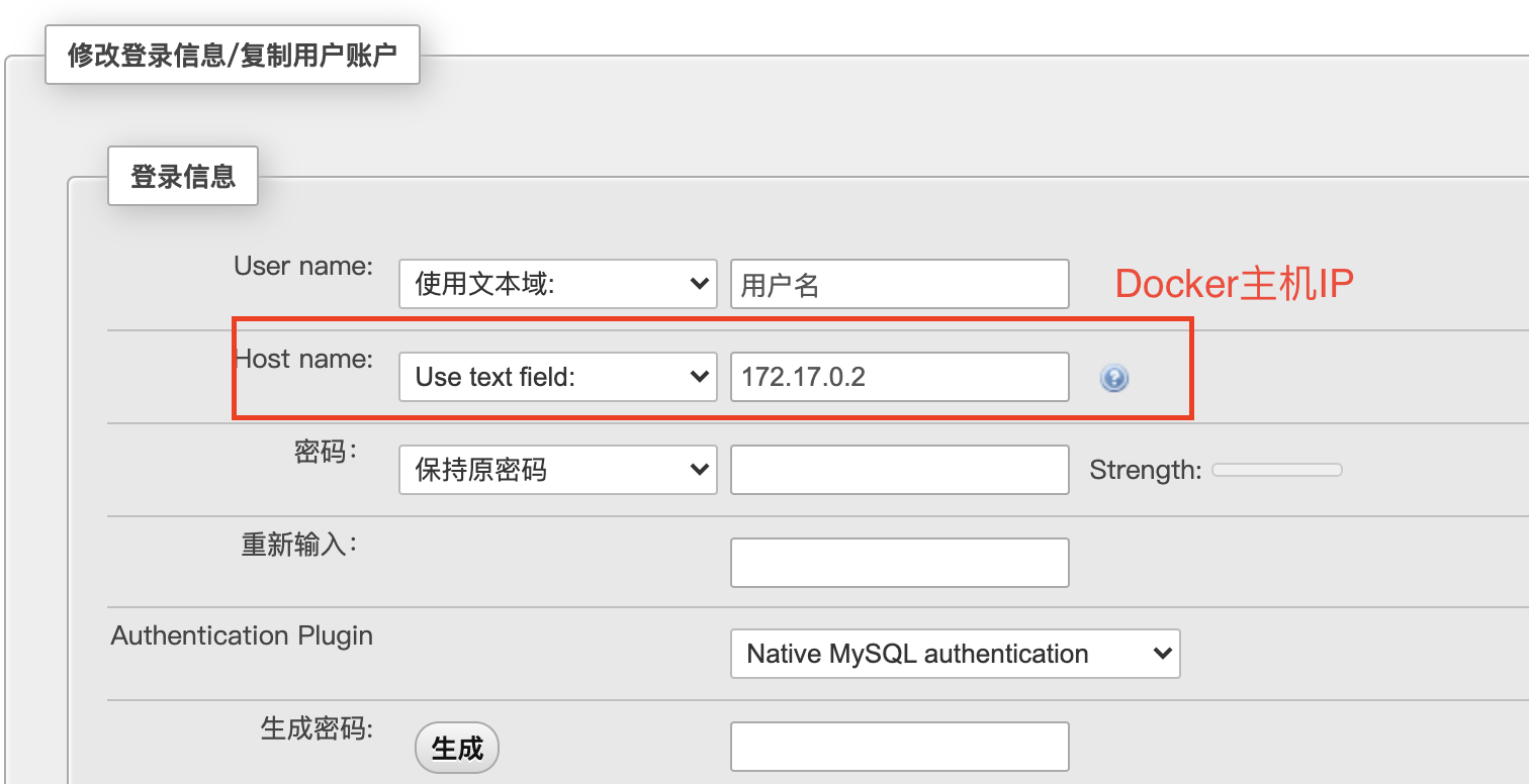 1、在mysql中建立一个数据库、用户名及密码,并授权。用户授权,需要指Docker主机的IP。因为bitwarden是在Docker中运行,而mysql是在实体主机中运行,需要指定访问权限