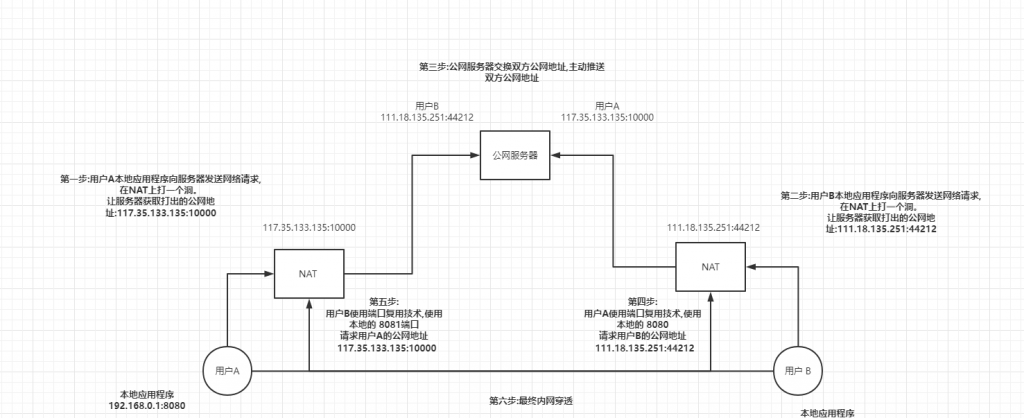 我们知道用户A和用户B都在各自的内网下,双方都不知道彼此的地址,那么如何进行通信成了问题。