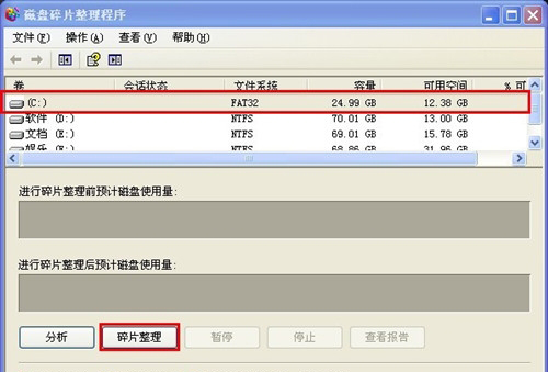 2.打开程序后,选中C盘,然后点击“磁盘碎片整理”按钮剖析并整理C盘的磁盘碎片。整理完成后,你可以这里其他磁盘的碎片。