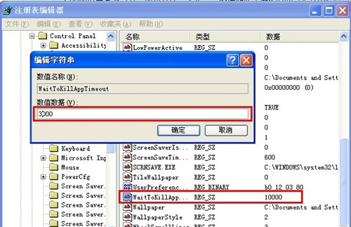 3.在右侧找到WaitToKillAppTimeout键值,然后双击此键,在弹出的窗体中输入数值数据为3000,即关闭程序的守候时间为3000毫秒,也就是3秒。