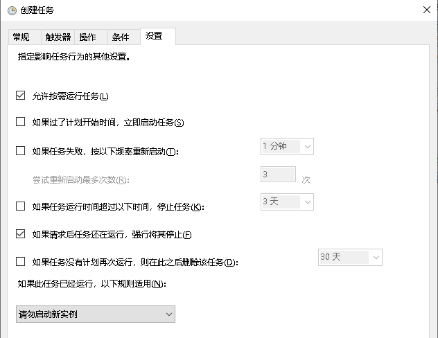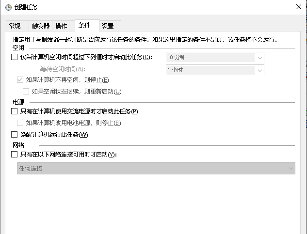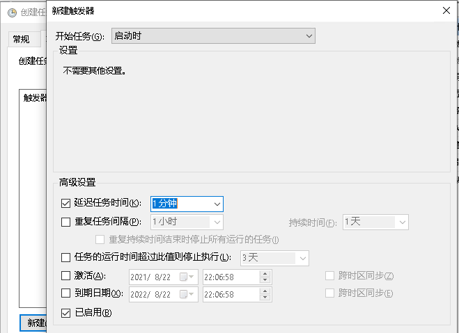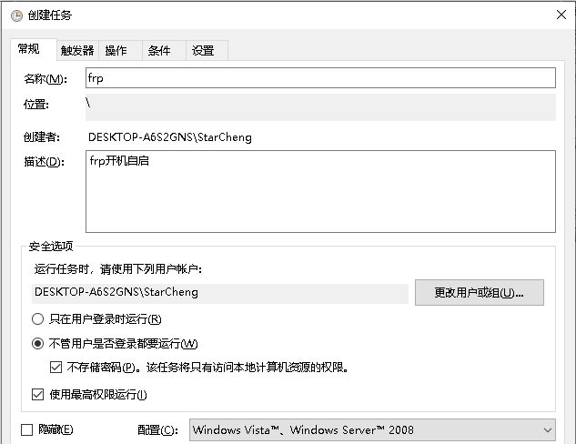 2.加start.bat添加进开机服务,右键【此电脑】-【管理】-【任务计划程序】-【创建任务】,并按如下操作,然后确定即可。