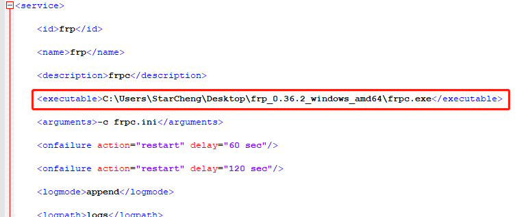 1.编辑文件winsw.xml,将路径替换为文件所在路径,如果是服务端就把frpc.exe更改为frps.exe