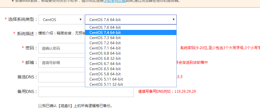 建议安装cenos 7.4~7.6都可以。大概等待2分钟,安装完成后。就有邮件通知安装完成,现在正式开始配置linux 都潮汇&宝塔面板了。