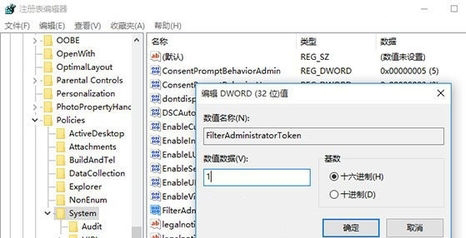 在右边找到 FilterAdministratorToken,双击后将数值数据改为“1”后点击“确定”。