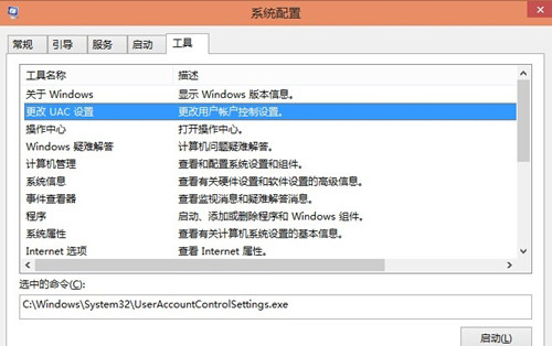 2、进入“系统配置”窗口后,我们很清楚的看到“更改UAC设置”,我们选择后再点击右下角的“启动”按钮。