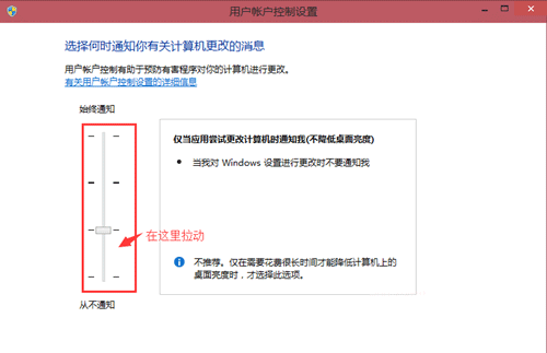 3、win10系统默认是拉到底的,所以在看图片时会提示“在禁用UAC时,无法激活此应用”,这时我们只需要用鼠标把滑块往上拉动即可,拉动时会有提示的,按照您的使用需求拉动。