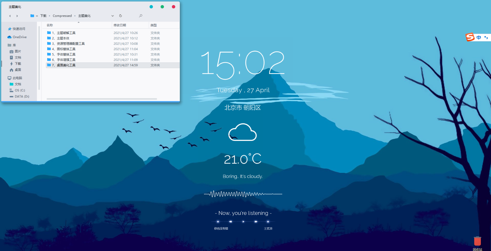 6、网易云音乐及波形频谱控件来源RainMeter百度贴吧,插件安装后会与效果图不符,需要将“桌面美化工具对应配置”中的配置文件拷贝到对应RainMeter皮肤目录下替换(实在是因为不会把这些皮肤合成才搞成这个样子)