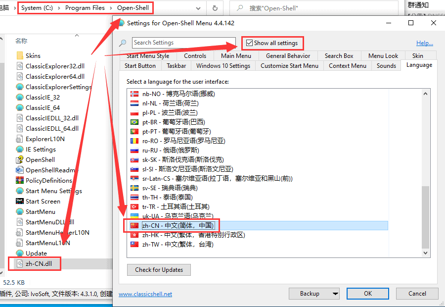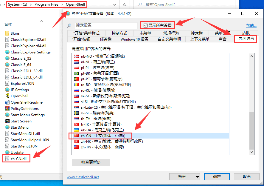 首先,你需要下载中文语言文件 zh-CN.dll 并放到Open-Shell安装目录(”一般是C:Program FilesOpen-Shell“),然后在设置界面选择“Show all settings”,然后选择语言选择框里面的“zh-CN – 中文(简体,中国)”,最后点击右下角的“OK”完成设置。