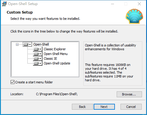 Open-Shell并没有多语言安装选项,只有英文安装界面。在Open-Shell安装过程中,我们可以看到它不仅修改开始菜单样式,而且也对资源管理器和IE浏览器进行了修改。如下图所示: