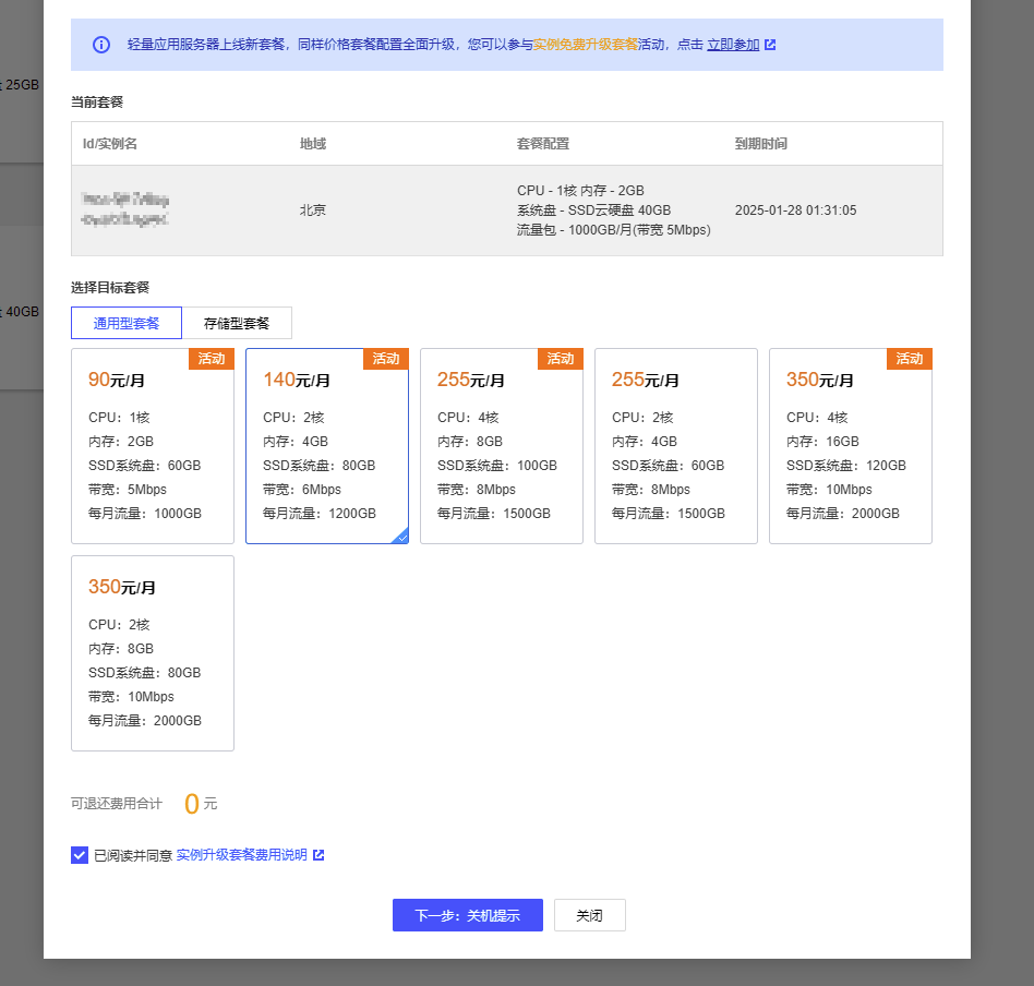 二、再次打开:https://curl.qcloud.com/DNpk1mGq 把续费次数用完。 以108元的优惠价续费一年,总共可以3次。记得续费完再进行第三步升级,否则升级后无法续费!