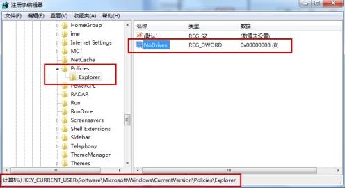 (2)注册表编辑器窗口中,依次展开到HKEY_CURRENT_USER - software - Microsoft - Windows - CurrentVersion - Ploicies - Explorer,找到NoDrives的选项后,将其删除即可;