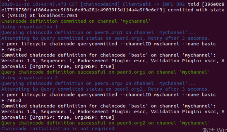 通道内所有组织都同意了链码定义之后,链码定义就可以提交到 channel 中。