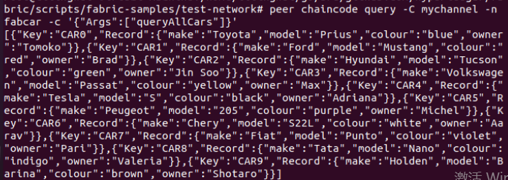 peer chaincode query -C mychannel -n fabcar -c '{"Args":["queryAllCars"]}'