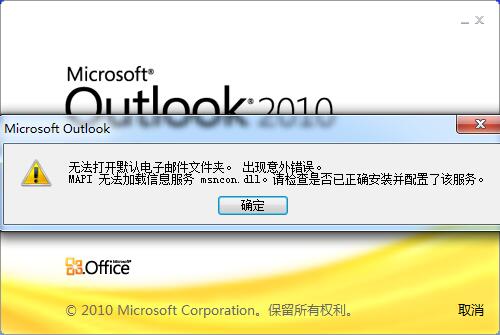 小编的电脑用的是Outlook 2010,在之前Outlook电子邮件账户使用一直没有问题,不知道什么原因最近在使用的时候突然出现无法打开的情况,本以为是权限的问题(小编电脑开启了UAC),但以管理员身份运行仍旧出现错误,提示“无法打开默认电子邮件文件夹。出现意外错误。MAPI无法加载信息服务msncon.dll。请检查是否已正确安装并配置了该服务。”