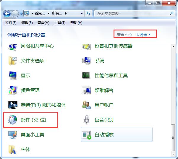 首先打开控制面板,把右上角的查看方式改为大图标,找到 邮件 选项,如果你的系统为64为则是 邮件(32位)