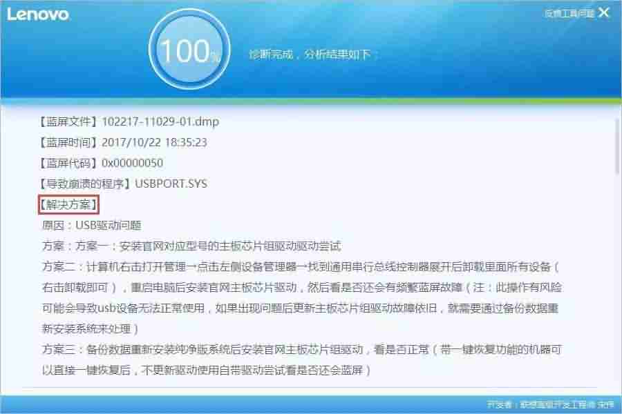 耐心等待诊断完成,就能看到【分析结果】和【解决方案】啦,并可以参照解决方案来治疗蓝屏啦。