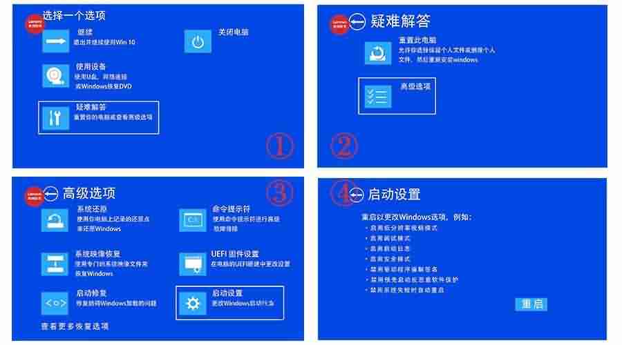 ① 使用电源按钮来重启计算机三次(等待开机出来再重启),进入Windows恢复环境 (WinRE),选择“疑难解答”—“高级选项“—“启动设置”—“重启”。