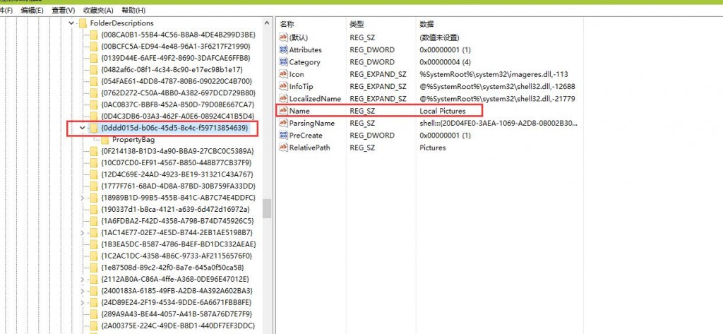 按照注册表项名的顺序,首先找到第一个对应“图片”文件夹的项“{0ddd015d-b06c-45d5-8c4c-f59713854639}”,我们可以通过该项右侧窗口中Name的数据值来判断是否是我们需要的项,这里“图片”对应的是英文名Local Pictures