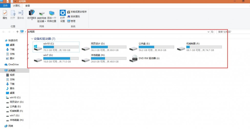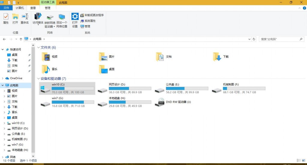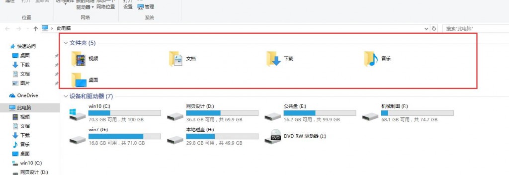 打开此电脑在首页除了显示各个磁盘分区外还有6个额外的“文件夹”。它们分别是:视频、图片、文档、下载、音乐、桌面。但是对大多数用户来说,这六个文件夹的使用率并不高,有时候还感觉有点“占地方”,许多朋友就想能够让它消失就好了。