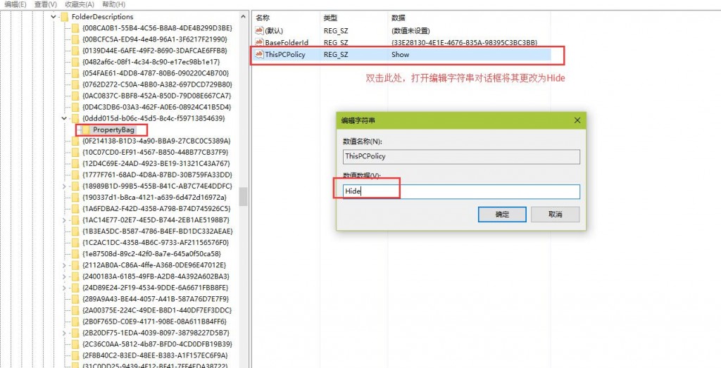 接着展开进入它的子项“PropertyBag”,双击右侧窗口中的“ThisPCPolicy”,将其数据数值由Show改为Hide,最后确定即可。