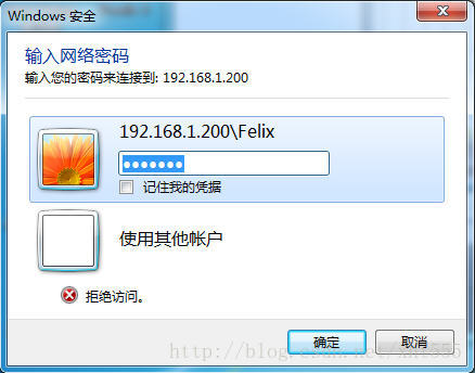访问默认共享时提示“拒绝访问”,言下之意是账号、密码都OK,可能是由于某种权限问题而无法访问对方的默认共享,如下图: