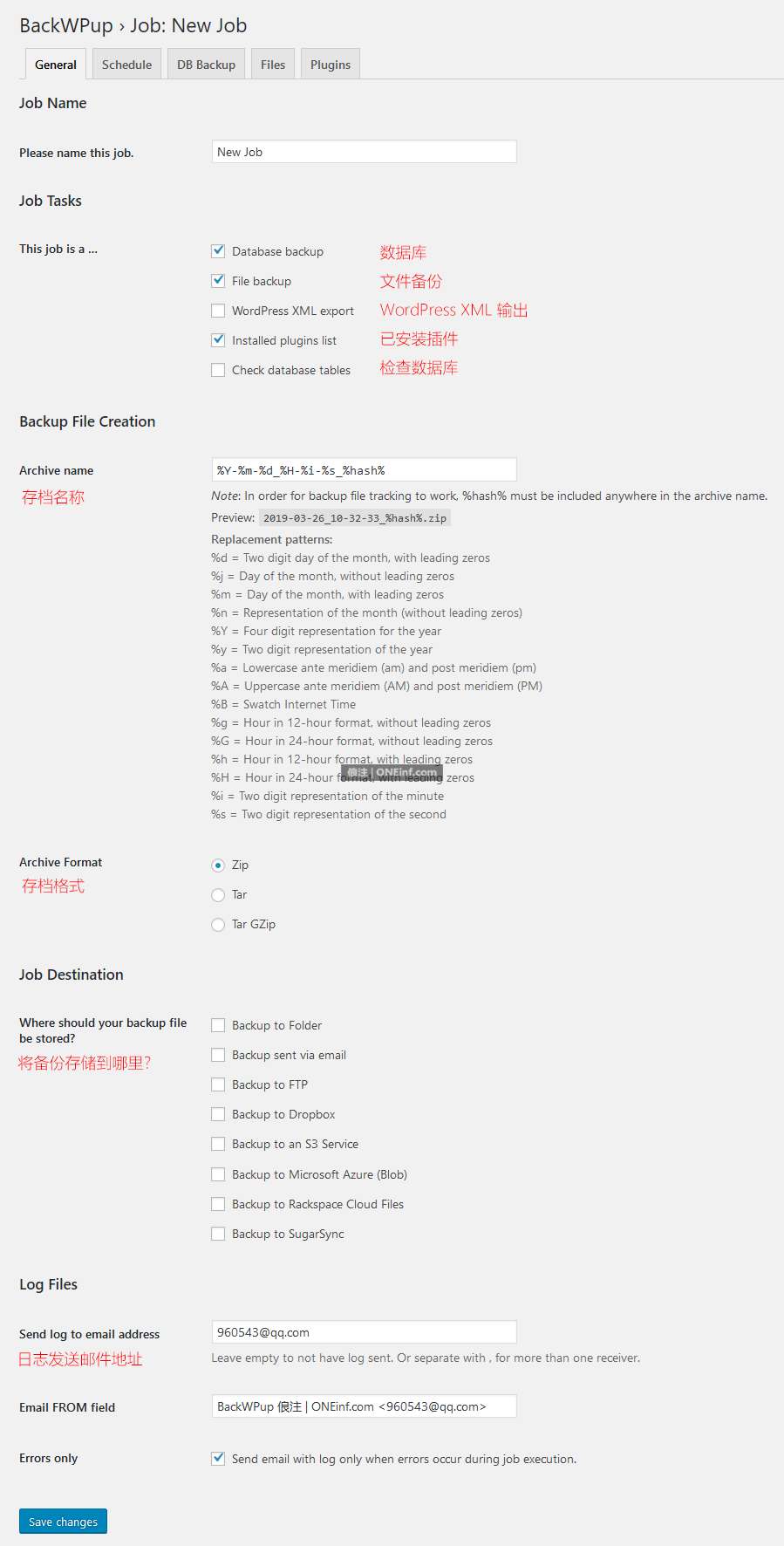 在左侧设置下方找到 BackWPup 下的 Add new job(新建备份任务) 就可以看到下图中的选项。只要简单的选择备份什么内容,如数据库和文件,存档名称不用修改,存档格式根据自己的需要,最后选择备份到哪里,就可以完成备份工作。