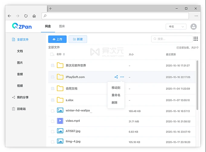 ZPan 的界面清新简约直观,支持多语言,可以支持文件及文件夹分享 (可以设置提取码、有效期,允许不登录访问);支持文档预览,以及音频和视频在线播放。在功能上它跟 Cloudreve 和 Z-File 比较相似,不过 ZPan 更好的地方就是「可以支持多用户」,同时也能支持用户的存储空间限制。