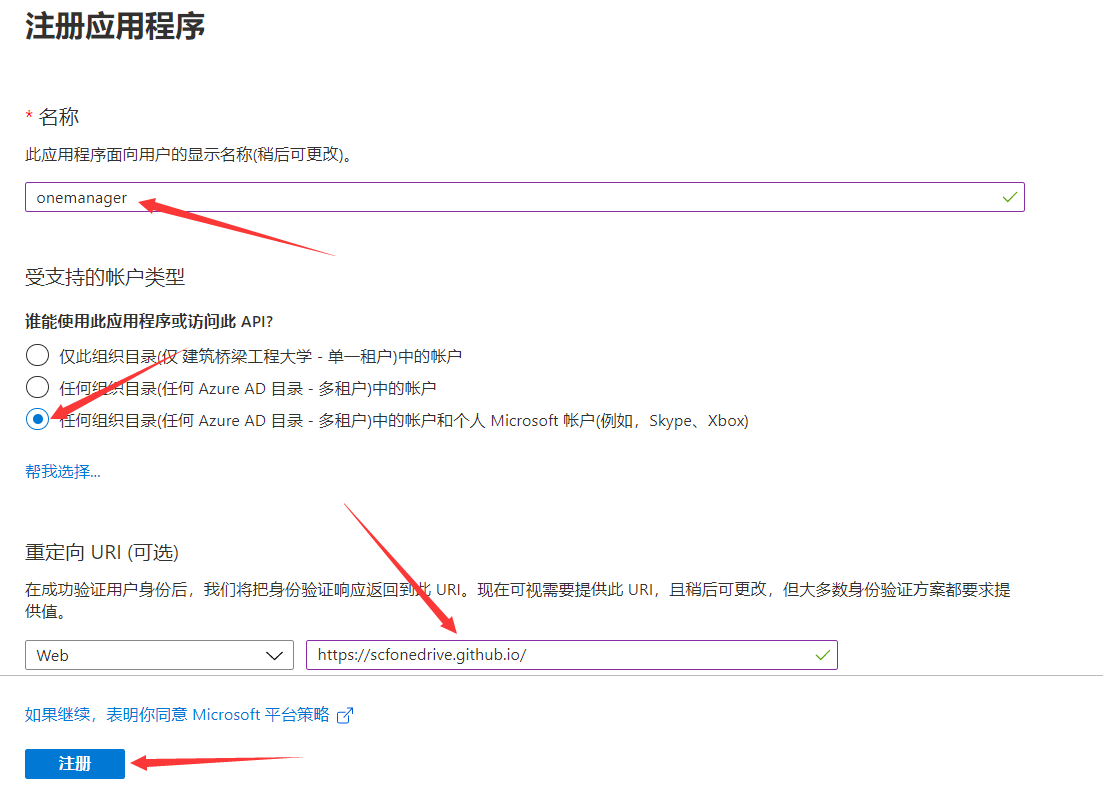 然后选择 新注册,应用名称随便,但是建议写简明好记的,比如onemanager,具体填写和选择的请按照下图,其中重定向URL地址为 https://scfonedrive.github.io/