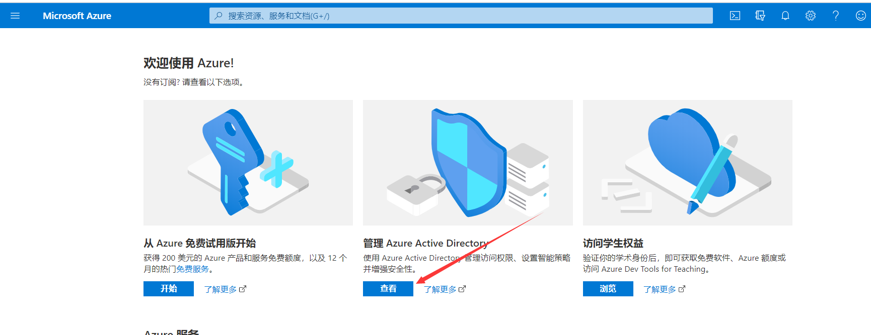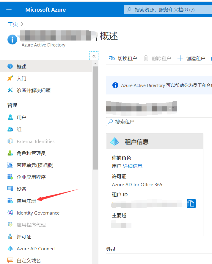 9、登录之后,找到Azure Active Directory并进入,然后点击左侧的 应用注册