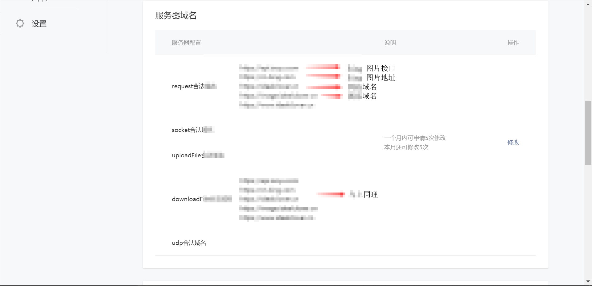 在 服务器域名 中添加如下合法域名: 注:理论上图床和图片地址不需要,只需要接口和域名即可,但我懒得改了。