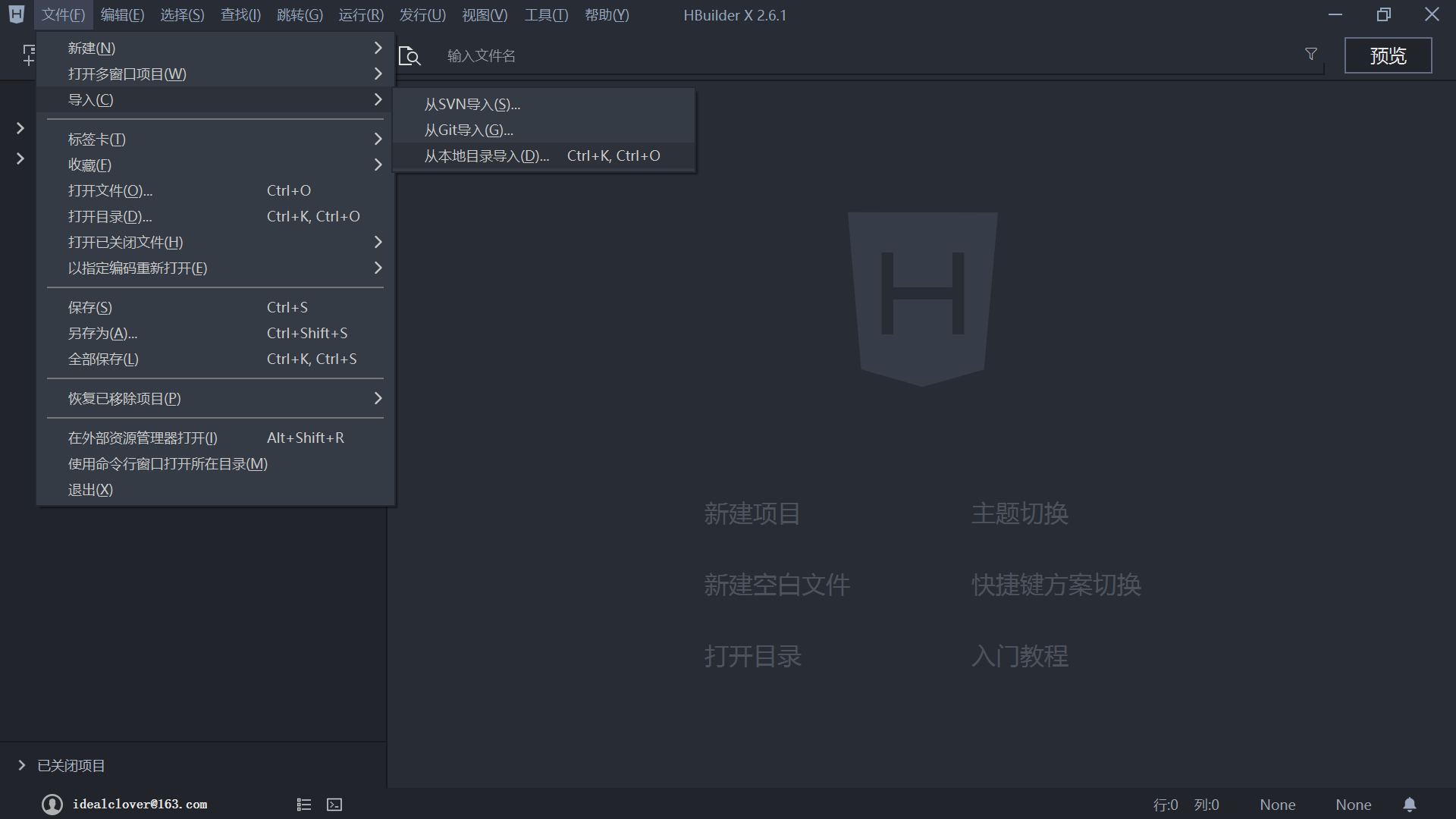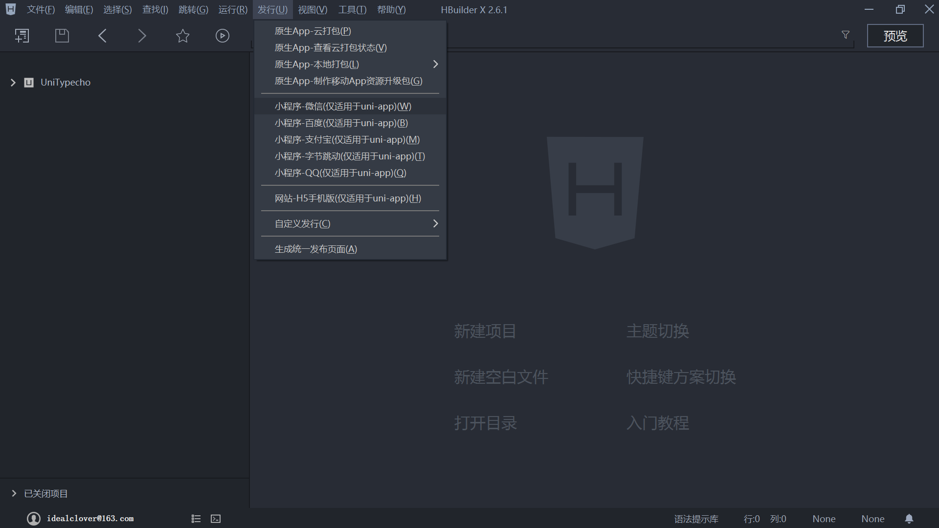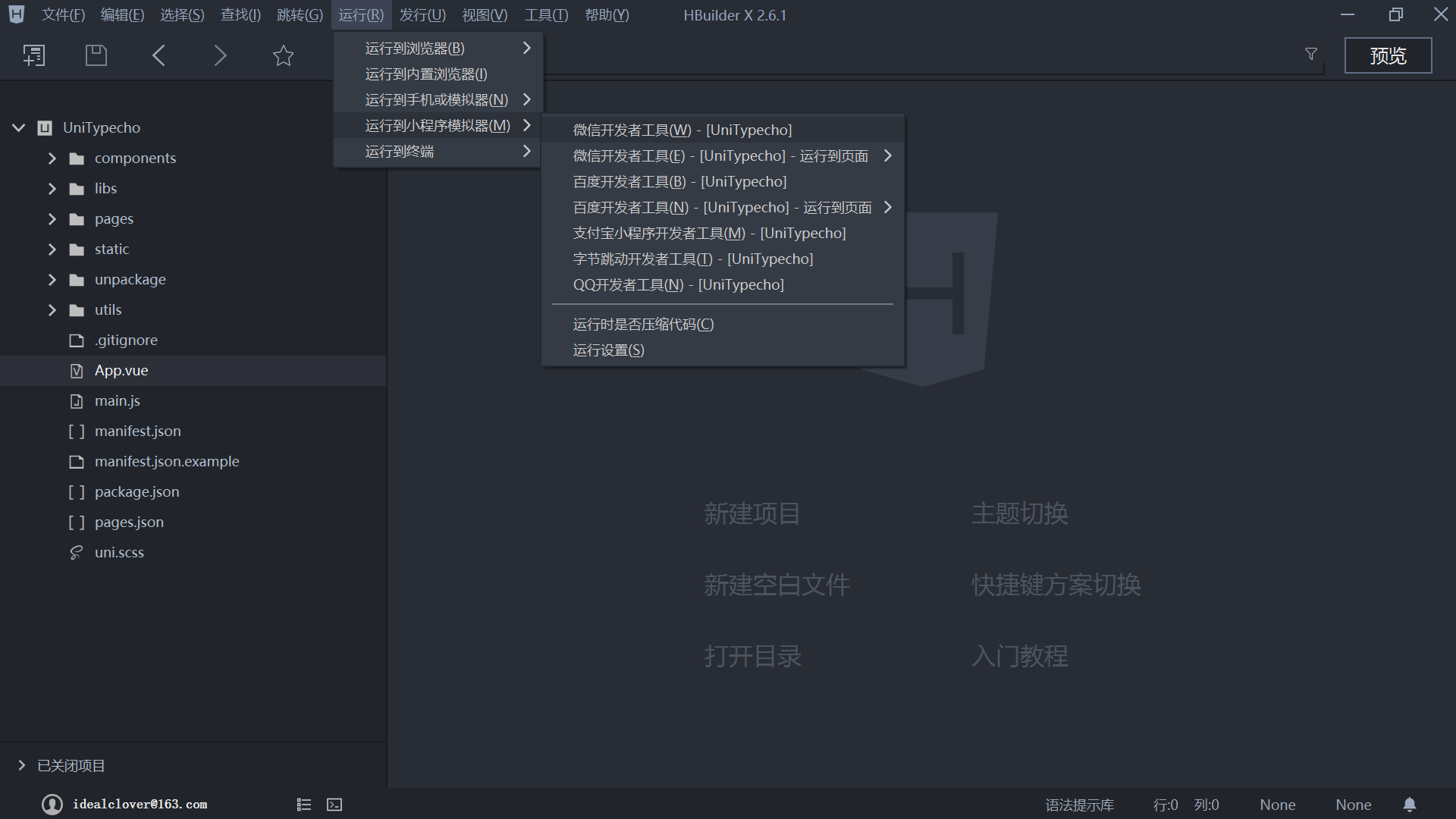 打开 HbuilderX,文件 - 导入 - 从本地目录导入,选择将上一步下载项目目录下的 UniTypecho 文件夹;