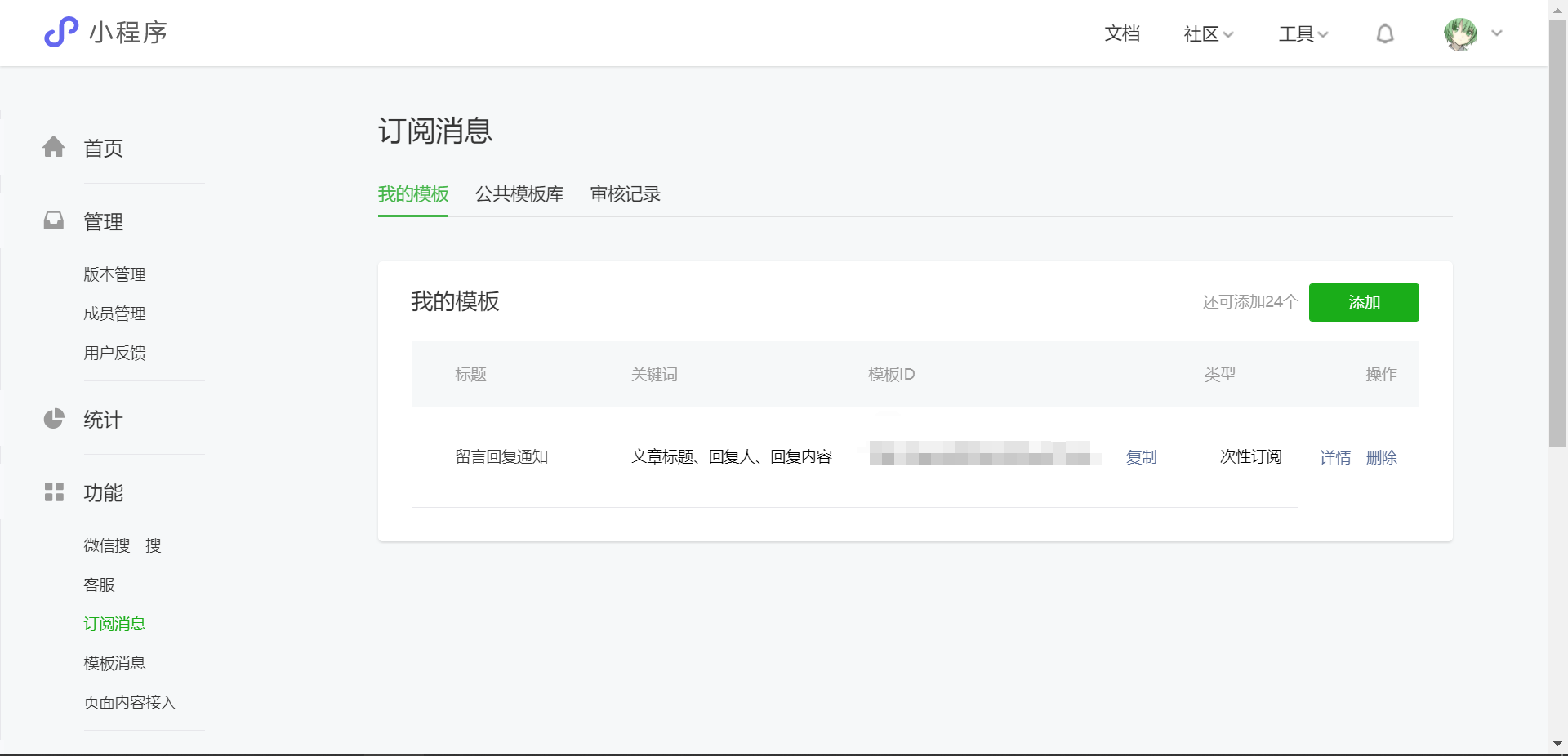 微信小程序后台 功能 - 订阅消息,添加 留言回复通知 将添加成功后的模板 ID 填入插件后台中