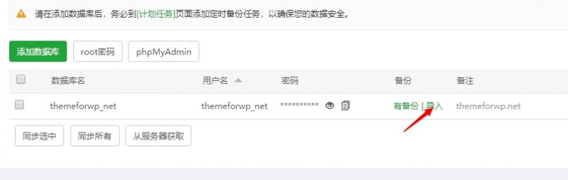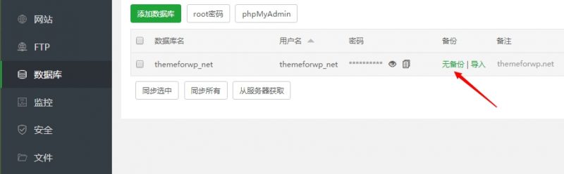 打开宝塔后台 – 数据库,点击如下图箭头所指的地方(如果你之前备份过,会显示有备份)