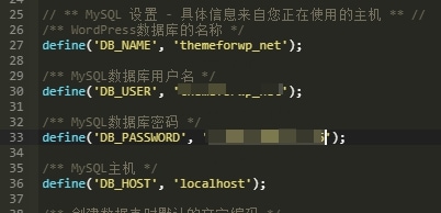 然后我们修改根目录下一个名为 wp-config.php 的文件,将其中的数据库信息修改为新站点的信息,这里一定不要忘记修改,不然会出现数据库连接错误