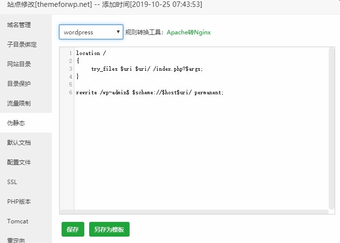 如果你的新站点文章页无法访问,那么很可能是伪静态的原因,在伪静态规则处选择WordPress,保存即可