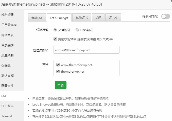 如果你之前的网站开启了https的话,那么新站点也需要开启https,不然就会出现网站无法访问的情况,选择 Let’s Encrypt,再申请一次即可,详细可查看 WordPress配置全站HTTPS教程