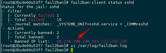 使用另一台服务器不断尝试连接SSH,并且不断的将密码输入错误,你会发现连续超过5次后直接连不上,说明IP被ban了,可以输入:fail2ban-client status sshd查看被ban的IP,如下截图。