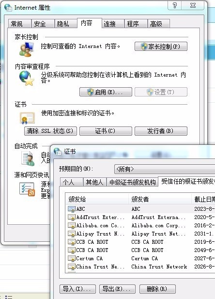 1.确定所访问的是一个大型、可信、安全的网站,否则请使用其他浏览器或止步该网站。 打开IE浏览器,点击“工具”——“Internet选项” ——“内容”选项卡,点击“证书”按钮,在打开的选项框中选择“受信任的根证书颁发机构”,接下来点左下角的“导入”按钮导入相关的证书即可