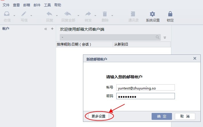 阿里云邮箱客户端设置步骤2、在 新建邮箱账户 界面输入账户、密码信息,或直接单击 更多设置 按钮。