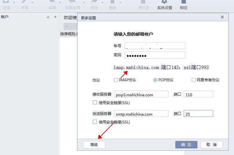 POP 协议,接收服务器名称:pop3.mxhichina.com,或者pop3.您的邮箱域名,端口号110,ssl加密端口995。