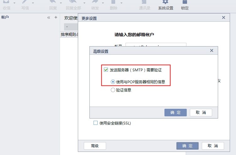 阿里云邮箱客户端设置步骤4、在上图所示界面中,单击 高级 按钮,确认 发送服务器(smtp)需要验证 已经勾选。