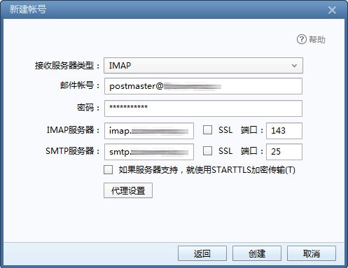 接收邮件服务器:imap.mxhichina.com,端口:143